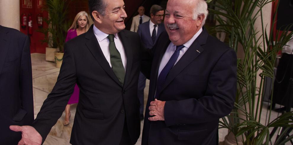 The Minister of Presidency, Interior and Social Dialogue of the Regional Government of Andalusia, Antonio Sanz, (l) smiles with the President of the Parliament of Andalusia, Jesús Aguirre, (r) during the Europa Press Andalusia breakfast meetings at the Cajasol Foundation, on September 28, 2022 in Seville (Andalusia, Spain). The Minister of Presidency, Interior and Social Dialogue of the Junta de Andalucía, Antonio Sanz, is the protagonist at the Europa Press breakfasts in collaboration with the Cajasol Foundation and with the sponsorship of Cepsa and Atlantic Copper
